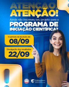 O Centro Universitário Dom Bosco do Rio de Janeiro – UniDomBosco-RJ e as Faculdades Dom Bosco publicaram o Edital nº 001/2025/CP, que abre inscrições para o Programa de Iniciação Científica (PIC).