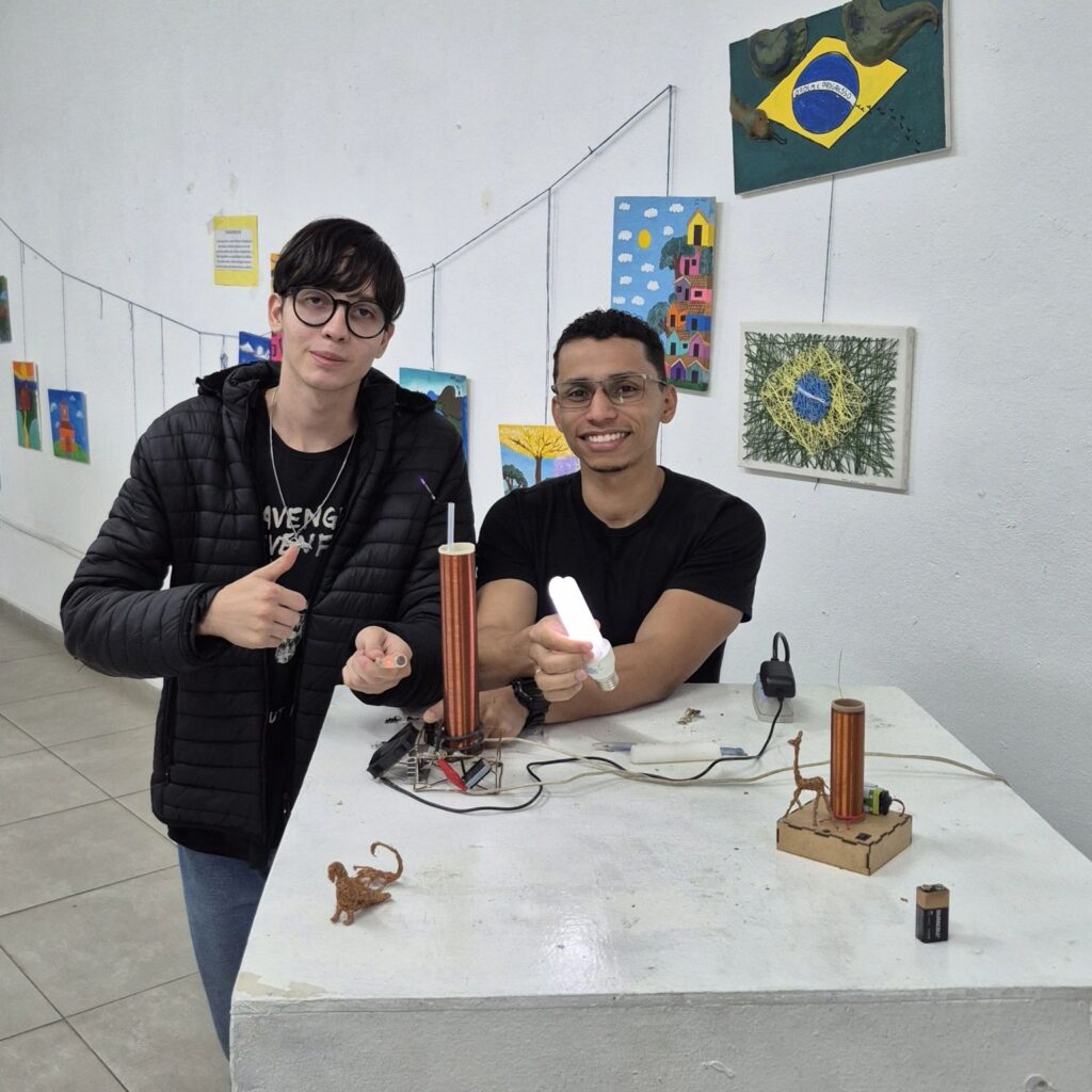 O segundo dia foi marcado por palestras sobre o CREA e sobre inovação e sustentabilidade, além de apresentações de projetos desenvolvidos pelos alunos. Lucas e o colega Estênio apresentaram o projeto da Bobina de Tesla, criado na disciplina de Eletromagnetismo, um exemplo prático de como a teoria ganha vida dentro dos laboratórios do UniDomBosco-RJ.